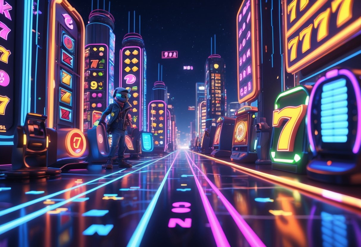 Mesin slot futuristik dengan lampu neon berwarna cerah di dalam kasino modern dengan latar belakang kota yang bercahaya.